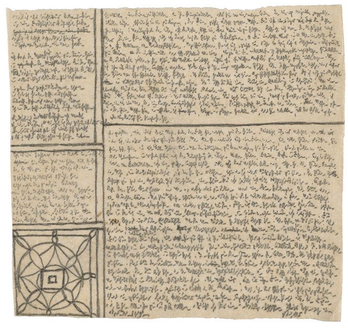I’ve touched on miniaturization as a simultaneously renewed and emergent strategy in contemporary art, but its effects can be observed in other media. Not quite contemporary, Robert Walser’s ‘micro-scripts’ resound with the memetic capacity of miniatures. Walser’s tiny writings were done with pencil, a noticeable shift from early twentieth century writers’ penchant for the typewriter. Walser’s miniascule writings were completed in an archaic German script. The meaning-making potentiality of the micro-scripts lies in its plying of a sub-German within German, like nesting dolls.